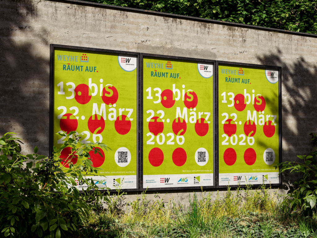 Entwicklung der Internetseite für das Ehrenamt in der Gemeinde Weyhe. Für das Projekt, „Weyhe räumt auf“ wurden Plakate, Banner, Aufsteller, Give aways undein Spiel zum Thema „Müllsammeln“ entwickelt.